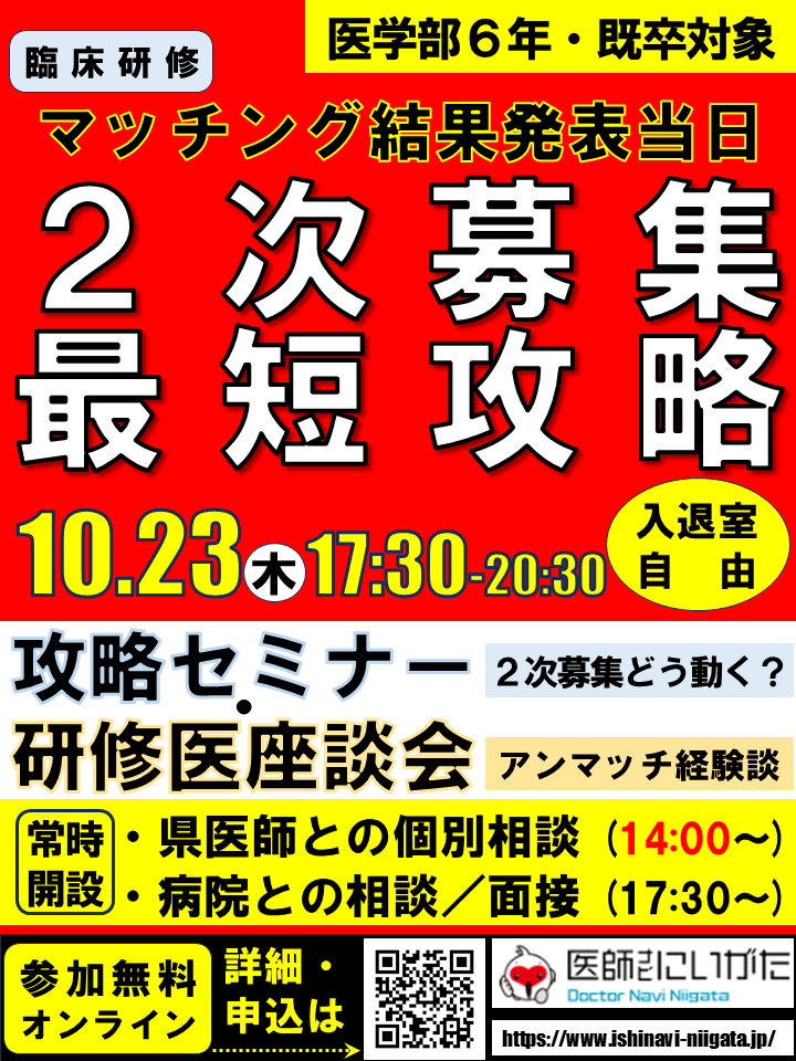 人気病院での研修をあきらめたくない方、なるべく手間をかけずにマッチしたい方、最短のマッチング対策を練りましょう! <タイムスケジュール> カッコ内は2回目の配信時間 17:30-17:40(19:30~19:40) イントロ・2025マッチング分析 17:40-18:15(19:40~20:15) 二次募集対策徹底解説~アンマッチ、どう動く?~ 18:15-18:30(20:15~20:30) 質疑応答 |