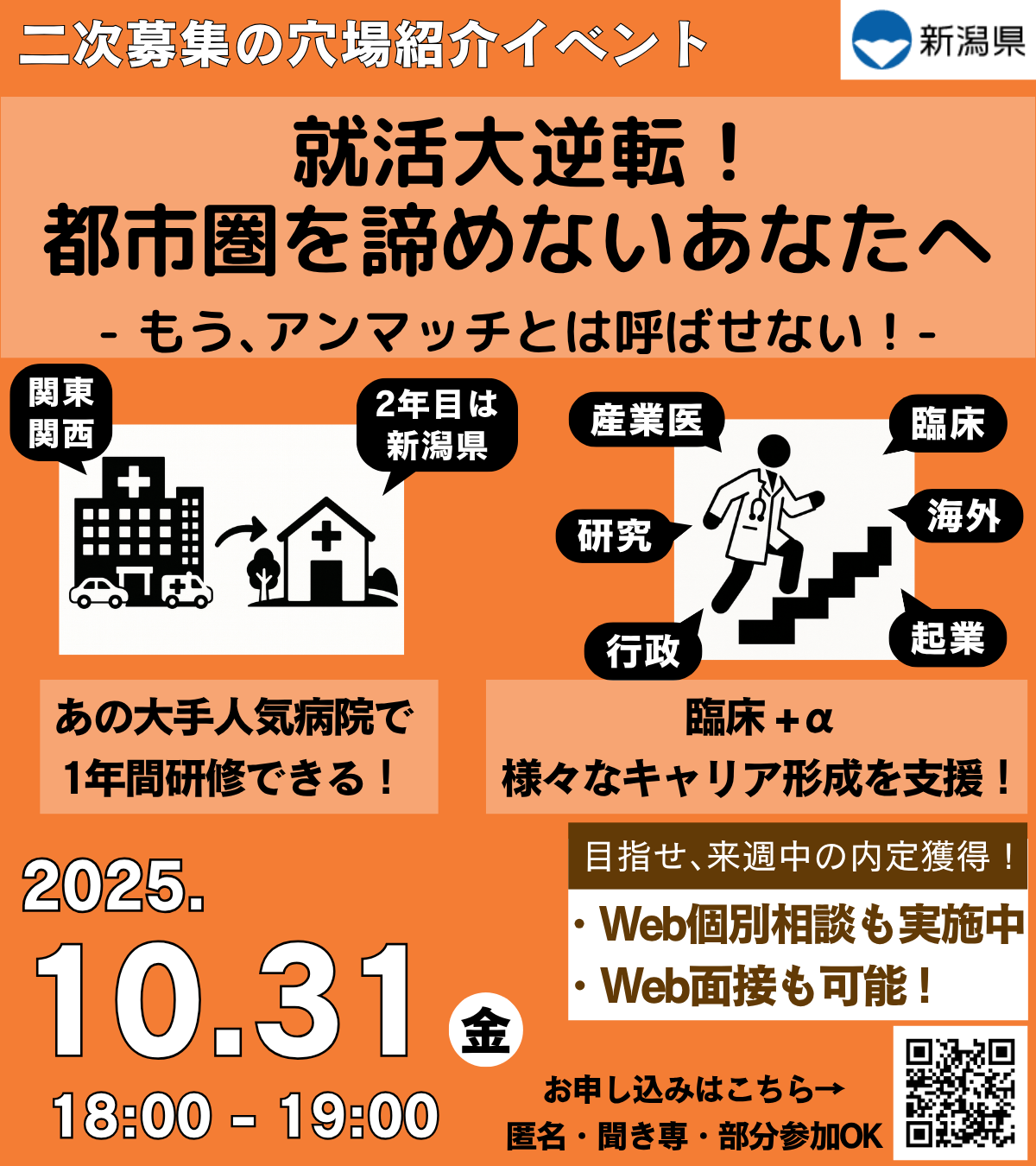 【2025.10.31オンライン開催決定】就活大逆転 ! 都市圏を諦めないあなたへ【2025臨床研修マッチング二次募集】
